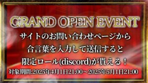 当サイト公開を記念して、サイトと連動したイベントを開催致します! 内容 HP内お問い合わせページから合言葉を入力し送信すると、Discord内限定ロールが貰える。 参加方法 報酬 ・Discord内限定ロール 期間 20 […]